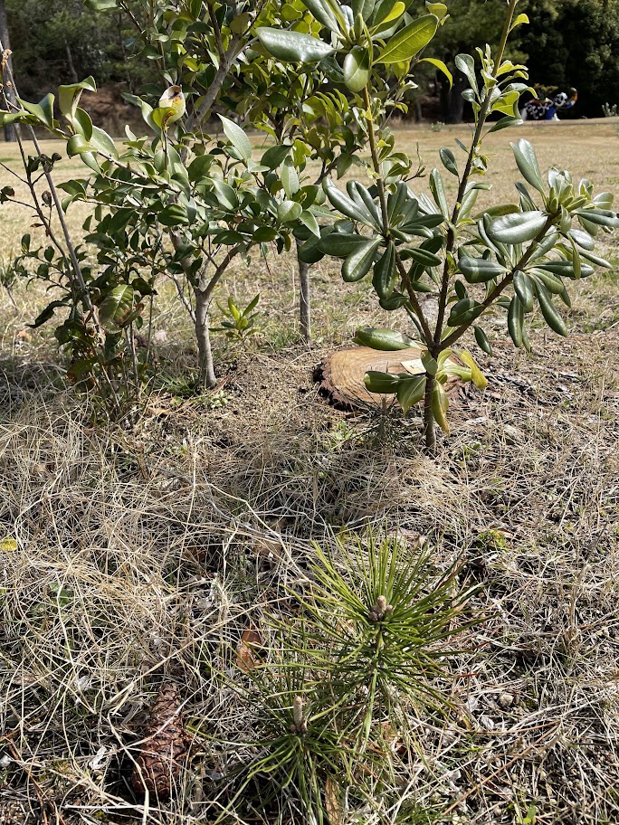スタッフOさんの考案で刈らずに残したクロマツの実生と、それを踏まれないように護衛するかのように混生する、同じく実生の照葉樹。マツを枯らす線虫は根にも残ってよくないらしいですが、生かす方の菌根菌もいそう。土の中の世界を見てみたい・・・
