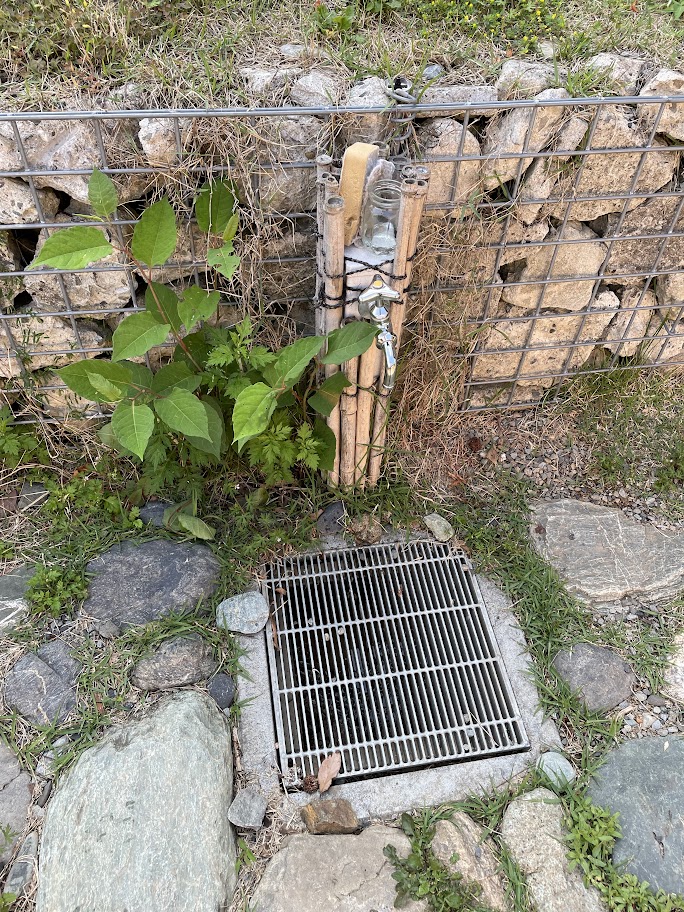石カゴ段差の下の茶色は、子供が次々ジャンプしたあと。