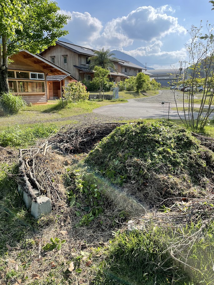 外構の全体竣工一年点検をしてきました。通路部も「芝生舗装」として広場と一体でつながっているため、草色が青々したいまごろ、芝はげの様子で利用が見えます。