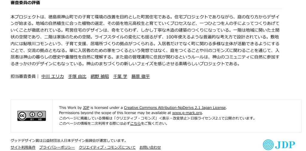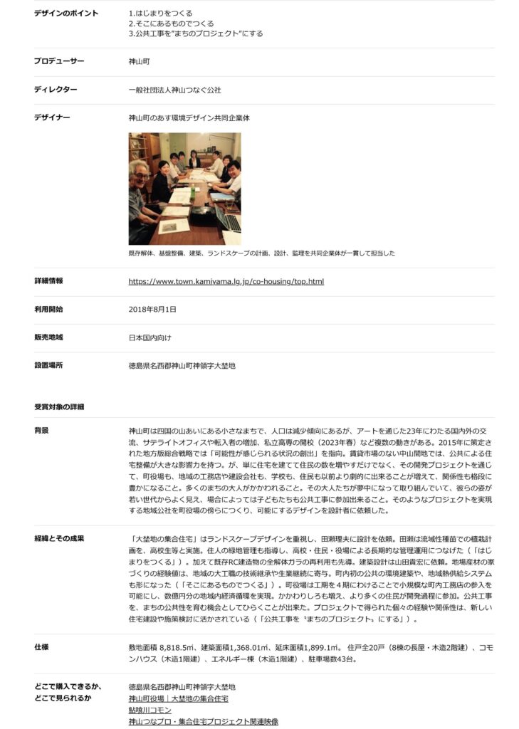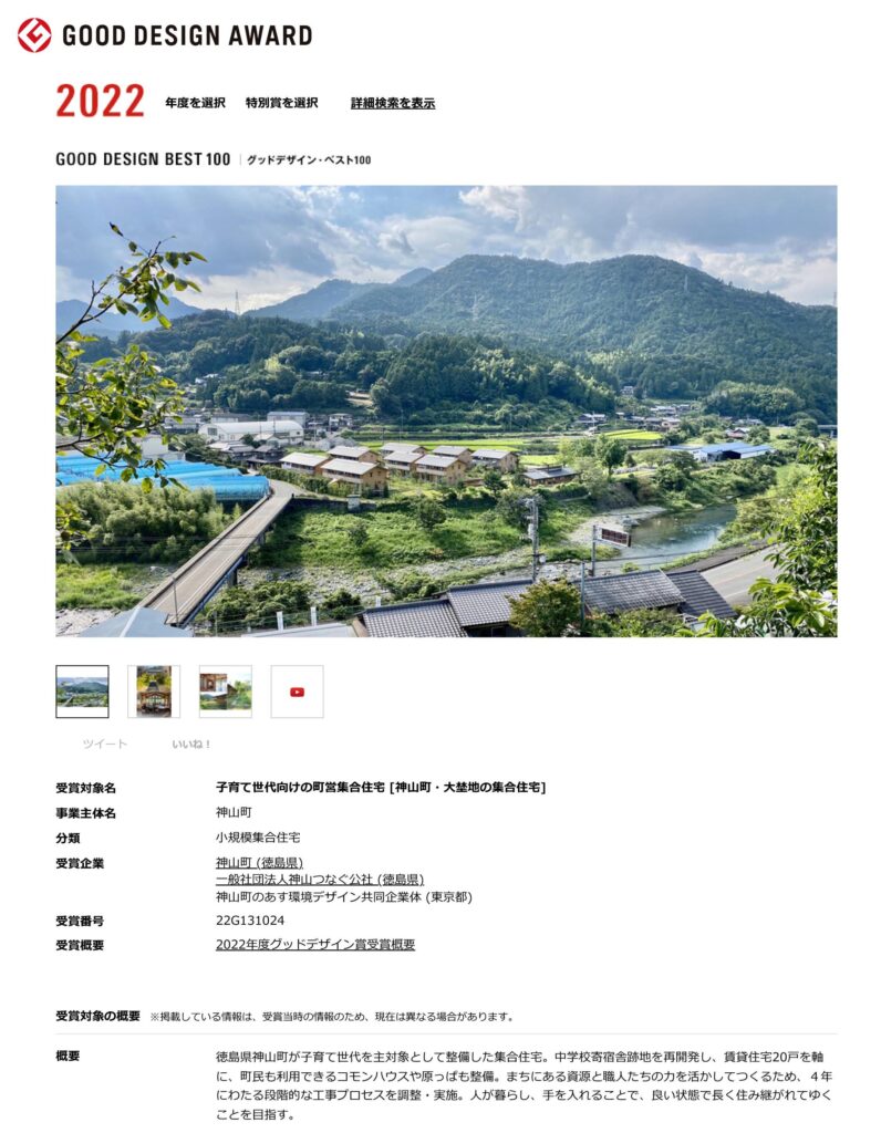 神山の「大埜地の集合住宅」がグッドデザイン賞ベスト100に選出されました。シンプルに整理したいと思いつつも、ソフト、ハードとももりもりに取り組んだため、どうしてもおなかいっぱいなプレゼンになってしまうジレンマがありました。施主は神山町、ディレクションは神山つなぐ公社、設計は神山町のあす環境デザイン共同企業体(神山町のあすJV)。JVの構成は4社の代表+募集した3名の設計協働者。役場職員も異動、公社もJVも既に散り散りとなったメンバーでのまとめは皆にとって大切な確認作業であり、充実した時間でした。同時に苦行そのもの。。。賞をいただけてほっとしました。