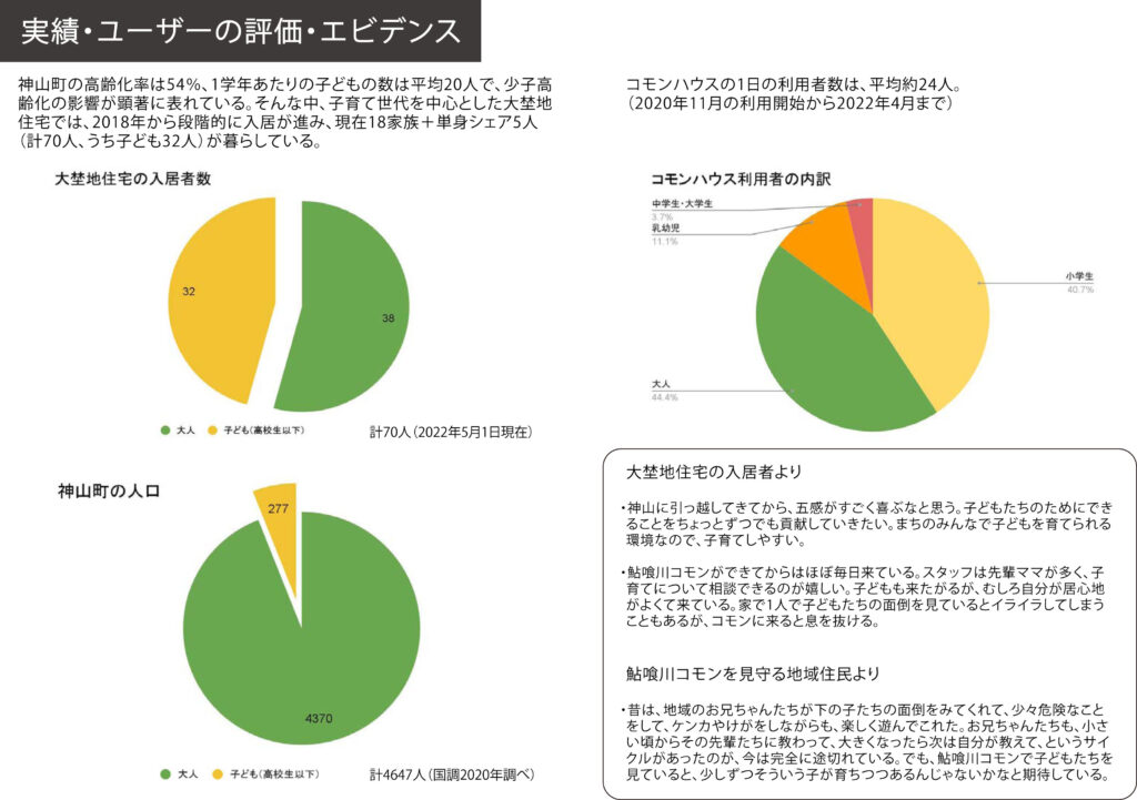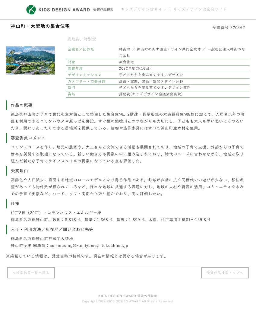 神山の「大埜地の集合住宅」がキッズデザイン奨励賞(キッズデザイン協議会会長賞)を受賞しました。神山つなぐ公社さんが取りまとめて提出くださいましたが、「子育て世代のための集合住宅」という切り口で、神山町が何を目指し、どうデザインされたかがわかりやすくプレゼンされていました。