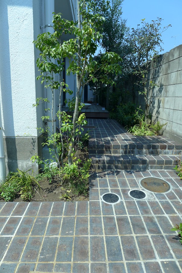 新しく購入したハード資材はレンガだが、通用門の通路とその脇の植栽帯土留めの両方を同素材1規格で作ることでメーカー直送手配を可能とし、無駄な運搬費などを排除するよう心掛けた。長年の切詰め剪定で枝先にこぶができた樹木などは、3年にわたる切戻し作業により矯正樹形から解放していくことを庭師に託した。