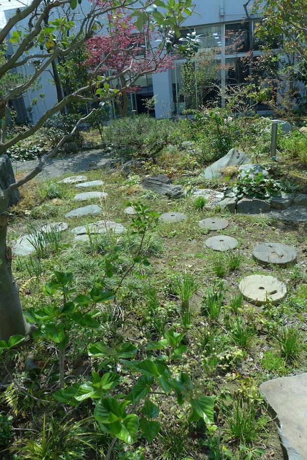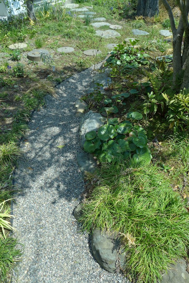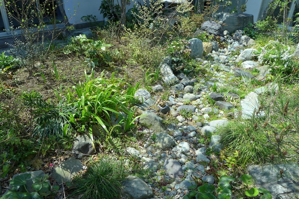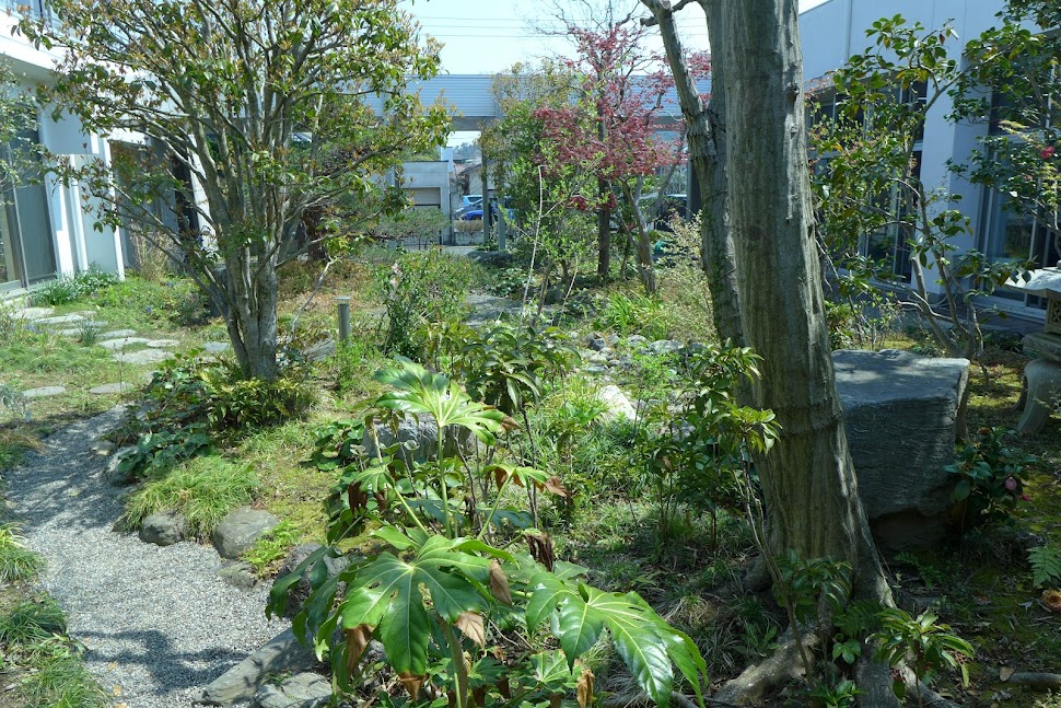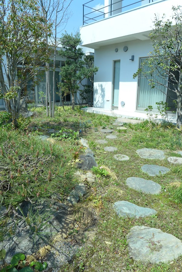 北関東の閑静な住宅街。事務所・住宅併設敷地にてすまいの改築に伴う庭園改修設計を担当した。代々受け継いだ重厚な和風庭園を、見るだけの庭でなく親しみやすいものに変えたいという施主の希望に沿う改修を検討した。歩ける小径をつくるために、やや掘り込んだ水みちに庭から出た石ころを集め、庭の片隅に在った石臼などを飛び石にし、バランスを見ながら低木を動かし、といった、職人の手間だけでできる改変を多く行っている。整えられてきた美しい苔やシダを活かし、なるべく大きな地殻変動を行わないように注意した。