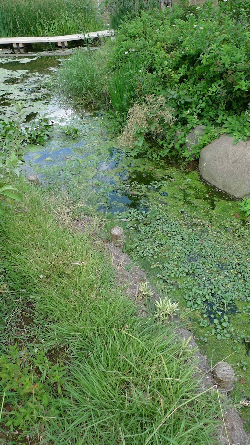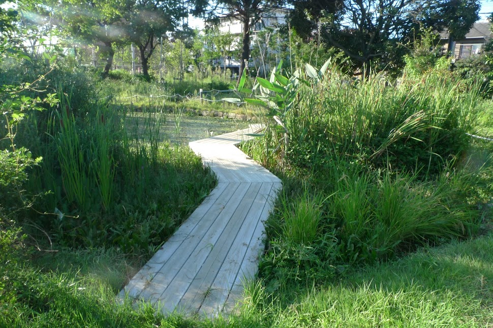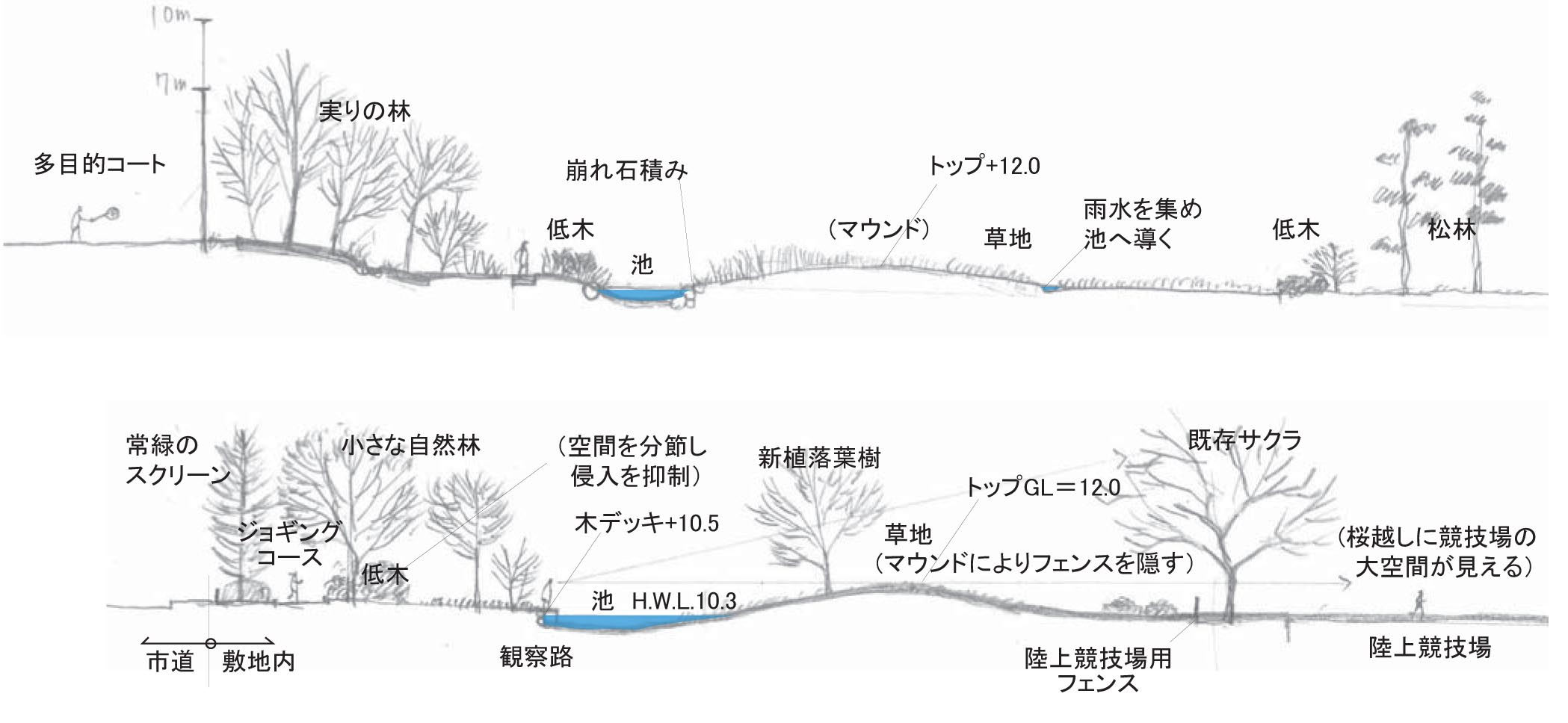敷地内にある寮を取り壊してスポーツ施設を増やす機会に、周囲の住宅地とのバッファーとなるエリアをどう計画するかという課題があった。将来スポーツ施設が拡張するかもしれないので、ハードなものは作りたくないという。そこで、もともと寮庭にあった小さなカエル池をヒントに、カエルの引っ越し先となる大きな池を中高生の環境教育用につくってはどうか、という提案をさせていただき、実施に至った。