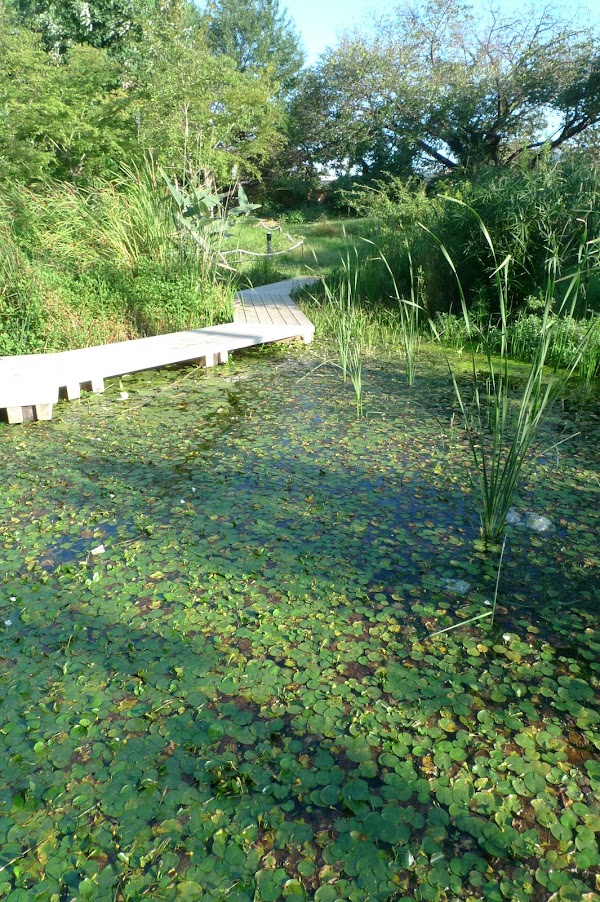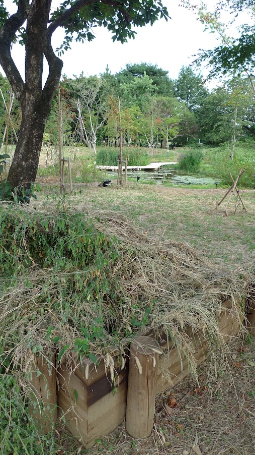 池底は近隣の休耕田から運んだ土を幾度も突き固めて作り、池の水は井戸を掘って利用し、落ち葉溜めも設けた。通りからは、池周りの低木、マウンド、その向こうの桜、グラウンドと続き、立体的に緩やかな目隠しを形成している。
