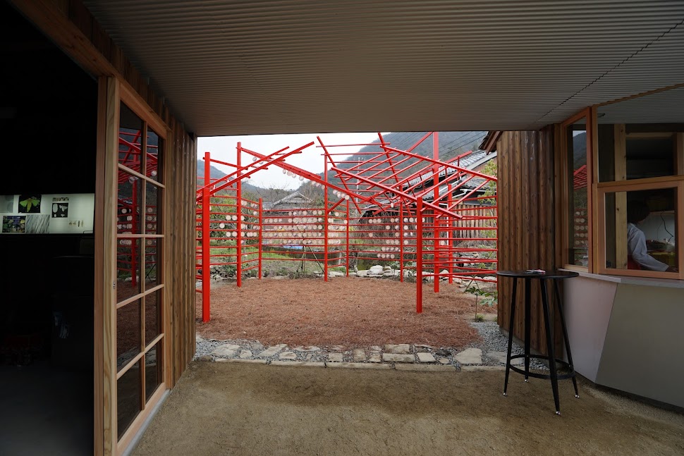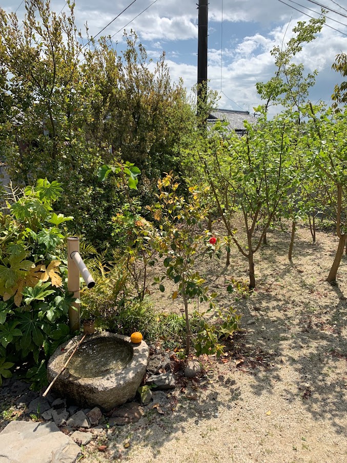 井戸、手水鉢、庭の水じまいシステムなど、そこに在るもので構成。奥の赤いおみくじ掛けは建築設計者によるもので、その足元は豊玉姫神社のある壇山の松葉をもらってきて敷きつめている。庭は施工関係上リセットされてしまい、当初はなかなかぼさぼさ感を出せなかったが、島の庭師さんに意図を伝え「適当な」管理を続けていただいた。(2022年の芸術祭をもって公開終了)